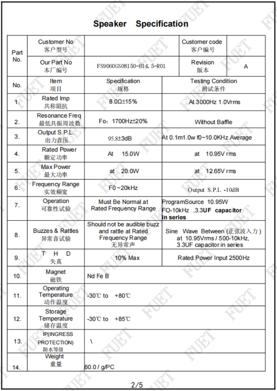 最低共振周波數(shù) 1700Hz±20% Without Baffle